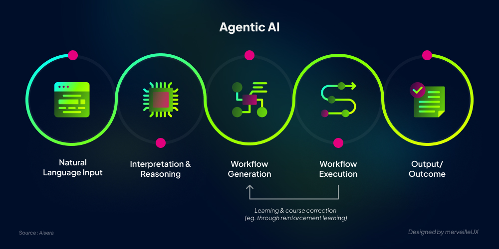 To truly grasp the stakes, we must distinguish Generative AI from Agentic AI. Where the former produces content (text, image, code) in response to a prompt, the latter produces actual work. An agent doesn’t just predict the next word; it uses an iterative reasoning cycle to achieve a goal. It observes its environment, plans steps, uses third-party tools (APIs, internal navigation), and evaluates its own results to correct its trajectory. This autonomy changes the very nature of interaction: we are moving from an interface of procedure ("how to do it") to an interface of intention ("what to get").