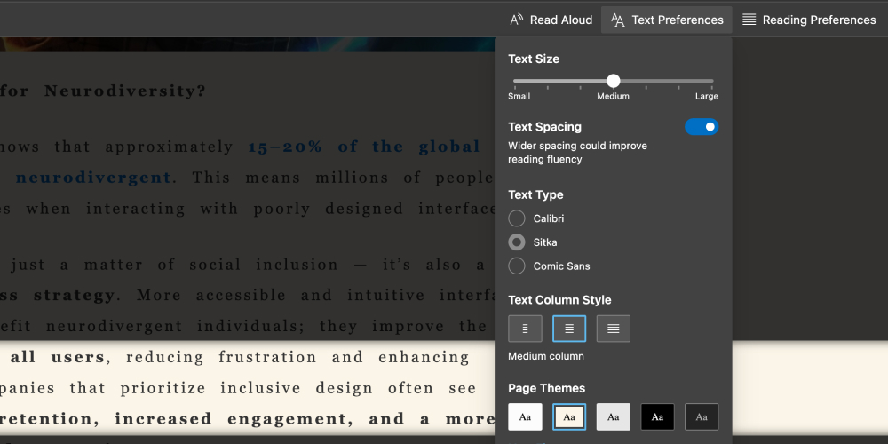 - Adaptive typography: providing accessible reading options (spacing, weight, specific fonts) that adjust without breaking the page layout.