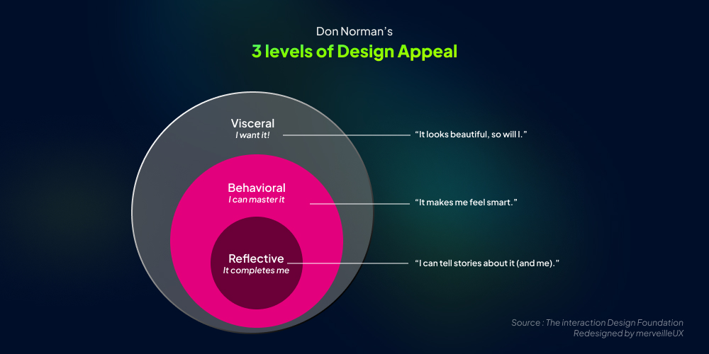 - A visually appealing interface (visceral) can encourage a user to explore further (behavioral), which reinforces their overall satisfaction (reflective).