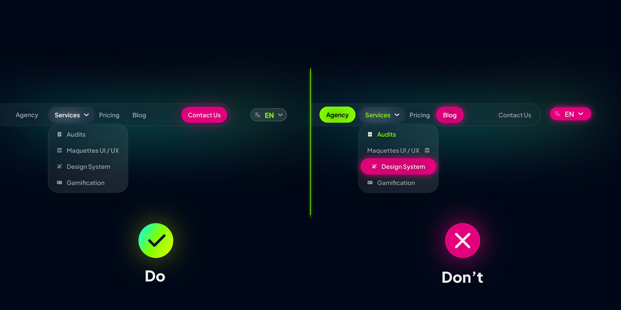Example: In a menu bar, pages and sub-pages, serving the same navigation function, should be similar (font, color, shape). This similarity aids in recognizing and distinguishing groups of elements, optimizing user understanding and action speed. Similarly, the CTA stands out with its style to encourage action, while the language switch, with a different function, adopts a distinct style. Similarity creates visual consistency that guides users and allows them to navigate more easily.