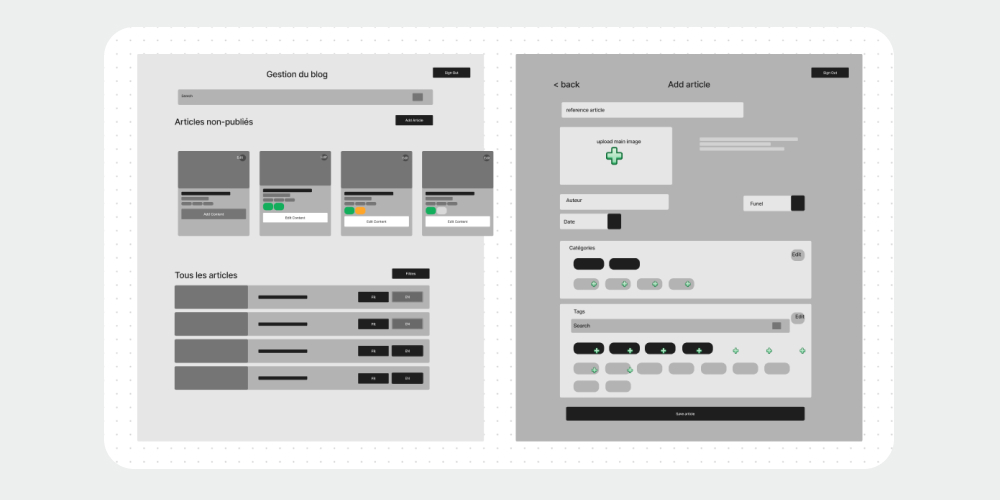 Contrairement aux wireframes low-fi qui se limitent à deux couleurs, les medium-fi intègrent une palette de nuances de gris pour mieux définir la hiérarchie visuelle des éléments. Cette approche permet de préciser davantage l'agencement des composants et d'apporter une première impression de l'esthétique générale de l'interface.